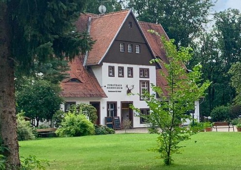 Die Lage ist einmalig auf einer Anhöhe umgeben von hohem Mischwald. Speisen und Getränke werden Ihnen auf einer großen Terrasse und im Forsthaus serviert.